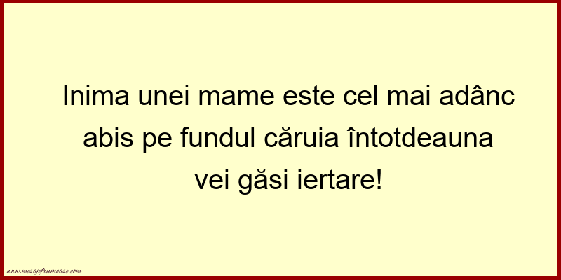 O singură imagine poate să transmită căldura și importanța familiei! Sperăm ca această imagine cu mesajul frumos Inima unei mame este cel mai adânc abis pe fundul căruia întotdeauna vei găsi iertare! vă va aduce lumină și inspirație în călătoria dumneavoastră prin lumea minunată a familiei.