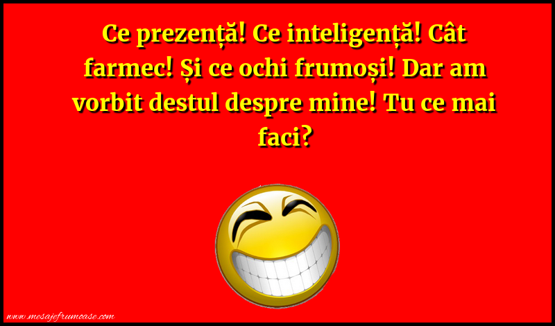 Umorul și amuzamentul se împletesc cu înțelepciunea și învățăturile vieții! Sperăm ca această imagine cu mesajul frumos Ce prezență! Ce inteligență! Cât farmec! Și ce ochi frumoși! Dar am vorbit destul despre mine! Tu ce mai faci? vă va aduce momente de amuzament și distracție în călătoria dumneavoastră prin viață.
