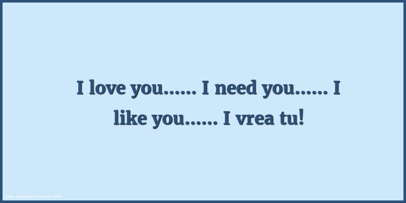 Umorul și amuzamentul se împletesc cu înțelepciunea și învățăturile vieții! Sperăm ca această imagine cu mesajul frumos I love you...... I need you...... I like you...... I vrea tu! vă va aduce momente de amuzament și distracție în călătoria dumneavoastră prin viață.