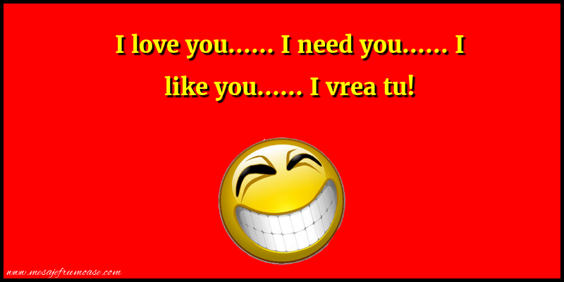Umorul și amuzamentul se împletesc cu înțelepciunea și învățăturile vieții! Sperăm ca această imagine cu mesajul frumos I love you...... I need you...... I like you...... I vrea tu! vă va aduce momente de amuzament și distracție în călătoria dumneavoastră prin viață.