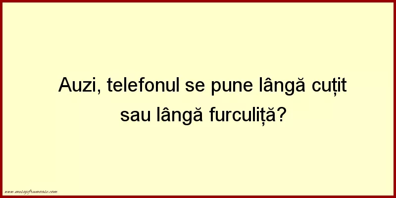 Umorul și amuzamentul se împletesc cu înțelepciunea și învățăturile vieții! Sperăm ca această imagine cu mesajul frumos Auzi, telefonul se pune lângă cuțit sau lângă furculiță? vă va aduce momente de amuzament și distracție în călătoria dumneavoastră prin viață.