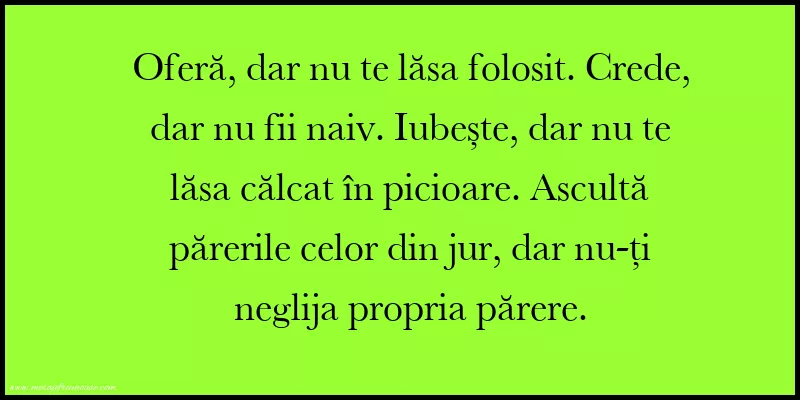 Oferă, dar nu te lăsa folosit. Crede, dar nu fii naiv. Iubește, dar nu te lăsa călcat în picioare. Ascultă părerile celor din jur, dar nu-ți neglija propria părere.