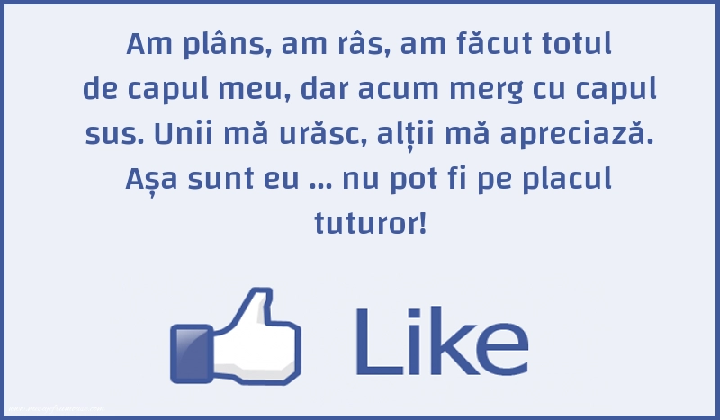 O singură imagine poate transmite înțelepciunea și importanța caracterului! Sperăm ca această imagine cu mesajul frumos Am plâns, am râs, am făcut totul de capul meu, dar acum merg cu capul sus. Unii mă urăsc, alții mă apreciază. Așa sunt eu... nu pot fi pe placul tuturor! să vă aducă lumina și inspirația de care aveți nevoie în călătoria dumneavoastră spre un caracter mai puternic și mai nobil.