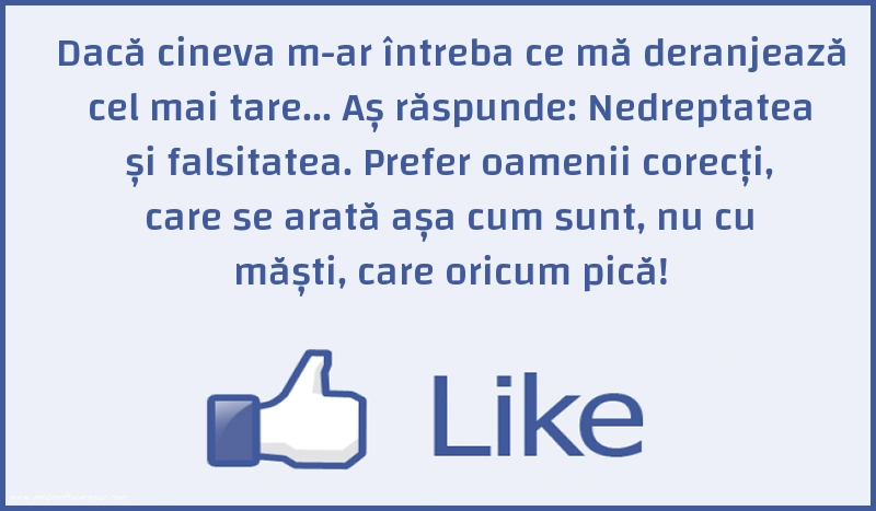 O singură imagine poate transmite înțelepciunea și importanța caracterului! Sperăm ca această imagine cu mesajul frumos Dacă cineva m-ar întreba ce mă deranjează cel mai tare... Aș răspunde: Nedreptatea și falsitatea. Prefer oamenii corecți, care se arată așa cum sunt, nu cu măști, care oricum pică! să vă aducă lumina și inspirația de care aveți nevoie în călătoria dumneavoastră spre un caracter mai puternic și mai nobil.