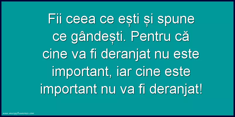 O singură imagine poate transmite înțelepciunea și importanța caracterului! Sperăm ca această imagine cu mesajul frumos Fii ceea ce ești și spune ce gândești. Pentru că cine va fi deranjat nu este important, iar cine este important nu va fi deranjat! să vă aducă lumina și inspirația de care aveți nevoie în călătoria dumneavoastră spre un caracter mai puternic și mai nobil.