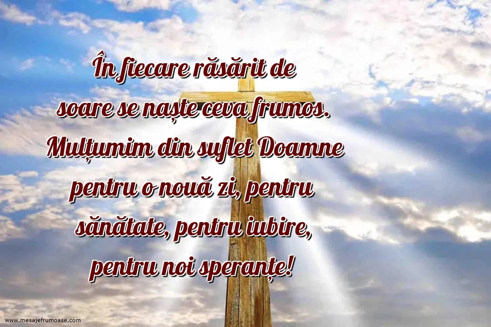 O singură imagine poate să transmită puterea și încrederea pe care o aduce credința! Sperăm ca această imagine cu mesajul frumos În fiecare răsărit de soare se naște ceva frumos. Mulțumim din suflet Doamne pentru o nouă zi, pentru sănătate, pentru iubire, pentru noi speranțe! vă va aduce lumină și inspirație în călătoria dumneavoastră spirituală și personală.