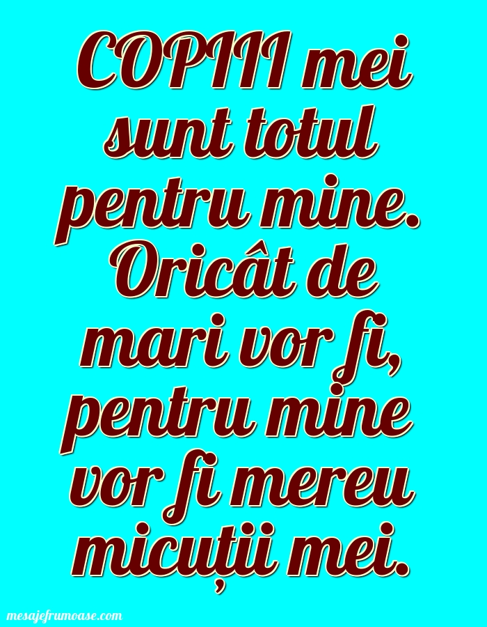 O singură imagine poate să transmită căldura și importanța familiei! Sperăm ca această imagine cu mesajul frumos COPIII mei sunt totul pentru mine. Oricât de mari vor fi, pentru mine vor fi mereu micuții mei. vă va aduce lumină și inspirație în călătoria dumneavoastră prin lumea minunată a familiei.