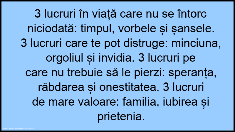 O singură imagine poate să transmită căldura și importanța familiei! Sperăm ca această imagine cu mesajul frumos 3 lucruri în viață care nu se întorc niciodată: timpul, vorbele și șansele. 3 lucruri care te pot distruge: minciuna, orgoliul și invidia. 3 lucruri pe care nu trebuie să le pierzi: speranța, răbdarea și onestitatea. 3 lucruri de mare valoare: familia, iubirea și prietenia. vă va aduce lumină și inspirație în călătoria dumneavoastră prin lumea minunată a familiei.