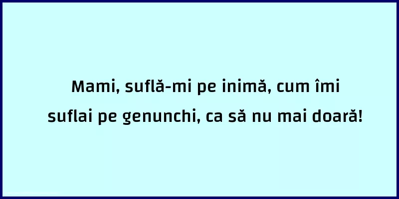 O singură imagine poate să transmită căldura și importanța familiei! Sperăm ca această imagine cu mesajul frumos Mami, suflă-mi pe inimă, cum îmi suflai pe genunchi, ca să nu mai doară! vă va aduce lumină și inspirație în călătoria dumneavoastră prin lumea minunată a familiei.