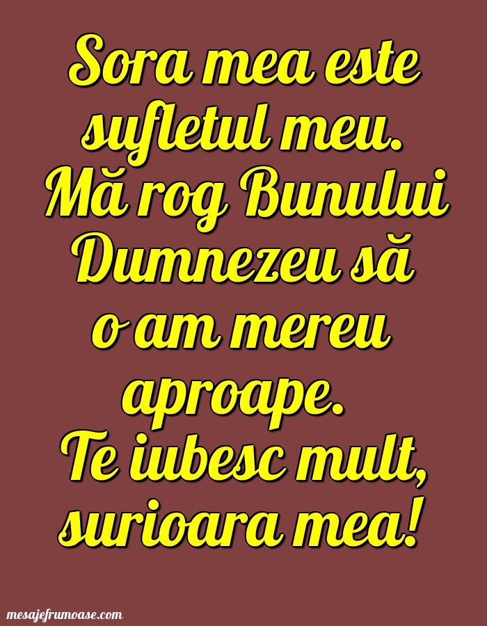 O singură imagine poate să transmită căldura și importanța familiei! Sperăm ca această imagine cu mesajul frumos Sora mea este sufletul meu. Mă rog Bunului Dumnezeu să o am mereu aproape. Te iubesc mult, surioara mea! vă va aduce lumină și inspirație în călătoria dumneavoastră prin lumea minunată a familiei.