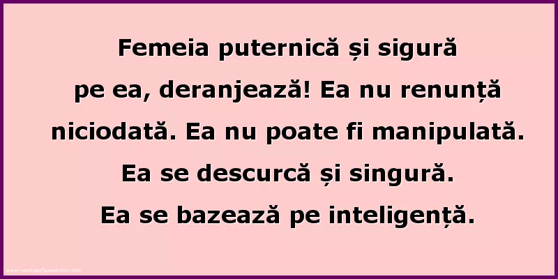 Femeia puternică și sigură pe ea, deranjează! Ea nu renunță niciodată. Ea nu poate fi manipulată. Ea se descurcă și singură. Ea se bazează pe inteligență.