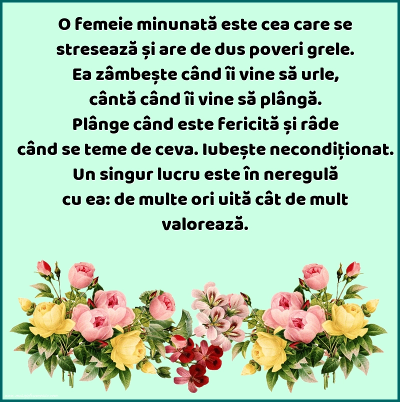 O femeie minunată este cea care se stresează și are de dus poveri grele. Ea zâmbește când îi vine să urle, cântă când îi vine să plângă. Plânge când este fericită și râde când se teme de ceva. Iubește necondiționat. Un singur lucru este în neregulă cu ea: de multe ori uită cât de mult valorează.