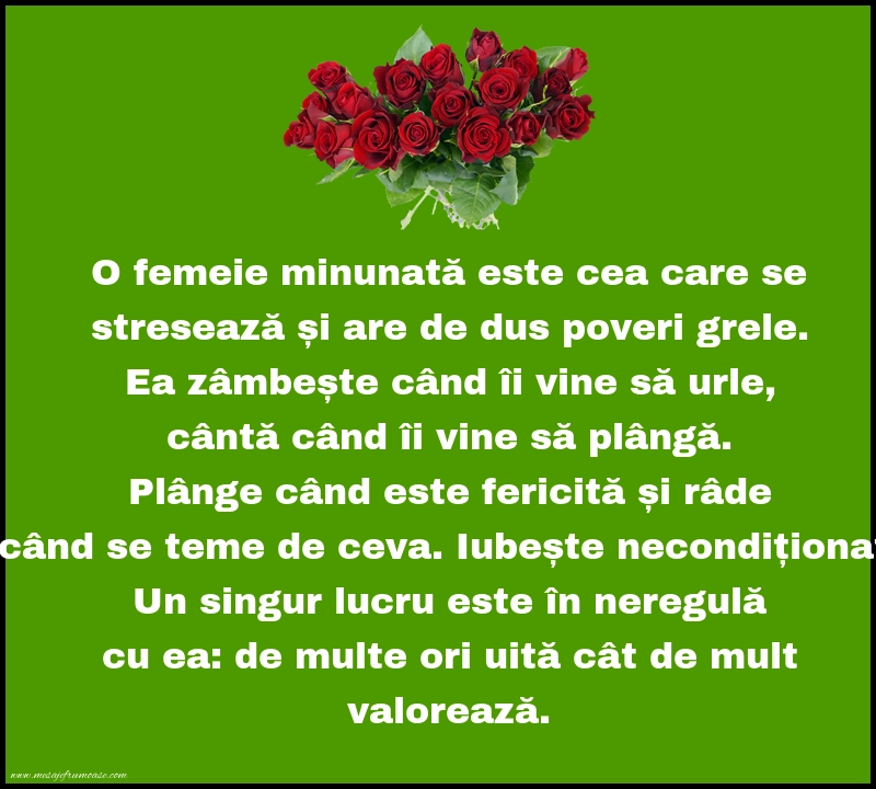 O femeie minunată este cea care se stresează și are de dus poveri grele. Ea zâmbește când îi vine să urle, cântă când îi vine să plângă. Plânge când este fericită și râde când se teme de ceva. Iubește necondiționat. Un singur lucru este în neregulă cu ea: de multe ori uită cât de mult valorează.