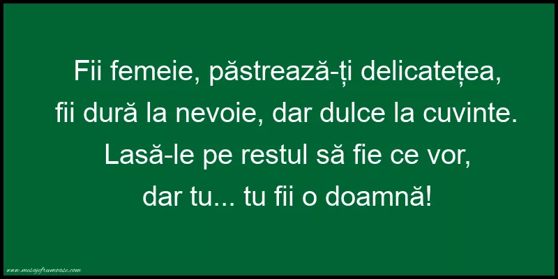 O singură imagine poate să ilustreze puterea și frumusețea femeilor! Sperăm ca această imagine cu mesajul frumos Fii femeie, păstrează-ți delicatețea, fii dură la nevoie, dar dulce la cuvinte. Lasă-le pe restul să fie ce vor, dar tu... tu fii o doamnă! vă va aduce lumină și inspirație în călătoria dumneavoastră spre recunoașterea și aprecierea valorii femeilor în societatea noastră.
