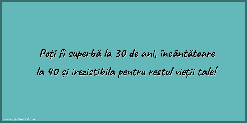 O singură imagine poate să ilustreze puterea și frumusețea femeilor! Sperăm ca această imagine cu mesajul frumos Poți fi superbă la 30 de ani, încântătoare la 40 și irezistibila pentru restul vieții tale! vă va aduce lumină și inspirație în călătoria dumneavoastră spre recunoașterea și aprecierea valorii femeilor în societatea noastră.
