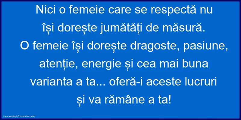 O singură imagine poate să ilustreze puterea și frumusețea femeilor! Sperăm ca această imagine cu mesajul frumos Nici o femeie care se respectă nu își dorește jumătăți de măsură. O femeie își dorește dragoste, pasiune, atenție, energie și cea mai buna varianta a ta... oferă-i aceste lucruri și va rămâne a ta! vă va aduce lumină și inspirație în călătoria dumneavoastră spre recunoașterea și aprecierea valorii femeilor în societatea noastră.