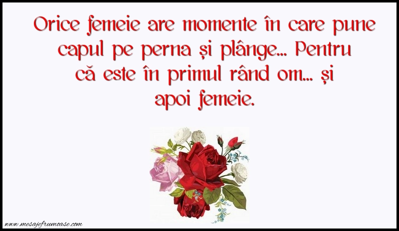 O singură imagine poate să ilustreze puterea și frumusețea femeilor! Sperăm ca această imagine cu mesajul frumos Orice femeie are momente în care pune capul pe perna și plânge... Pentru că este în primul rând om... și apoi femeie. vă va aduce lumină și inspirație în călătoria dumneavoastră spre recunoașterea și aprecierea valorii femeilor în societatea noastră.