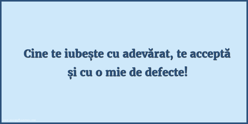 O singură imagine poate să exprime întreaga profunzime a iubirii! Sperăm ca această imagine cu mesajul frumos Cine te iubește cu adevărat, te acceptă și cu o mie de defecte! să vă aducă lumină și inspirație în călătoria dumneavoastră prin lumea iubirii.