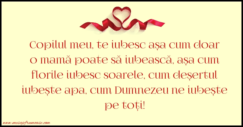 Copilul meu, te iubesc așa cum doar o mamă poate să iubească, așa cum florile iubesc soarele, cum deșertul iubește apa, cum Dumnezeu ne iubește pe toți!