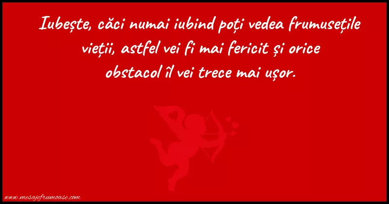 Iubește, căci numai iubind poți vedea frumusețile vieții, astfel vei fi mai fericit și orice obstacol îl vei trece mai ușor.