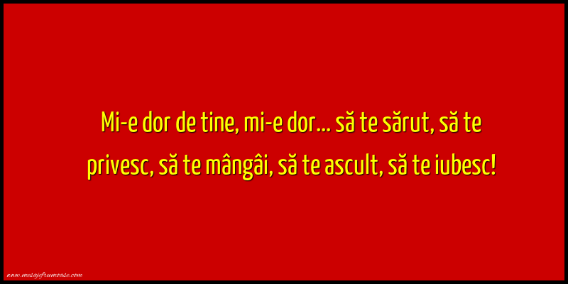 O singură imagine poate să exprime întreaga profunzime a iubirii! Sperăm ca această imagine cu mesajul frumos Mi-e dor de tine, mi-e dor... să te sărut, să te privesc, să te mângâi, să te ascult, să te iubesc! să vă aducă lumină și inspirație în călătoria dumneavoastră prin lumea iubirii.