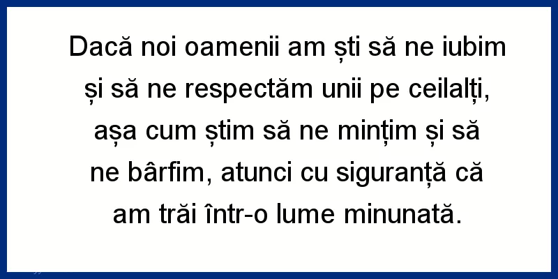 Dacă noi oamenii am ști să ne iubim și să ne respectăm unii pe ceilalți, așa cum știm să ne mințim și să ne bârfim, atunci cu siguranță că am trăi într-o lume minunată.