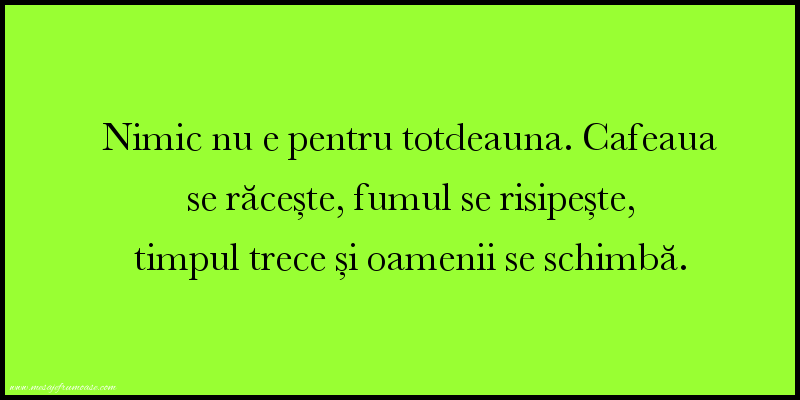 O singură imagine poate să ilustreze complexitatea și frumusețea umanității! Sperăm ca această imagine cu mesajul frumos Nimic nu e pentru totdeauna. Cafeaua se răcește, fumul se risipește, timpul trece și oamenii se schimbă. vă va aduce lumină și inspirație în călătoria dumneavoastră prin lumea umanității.