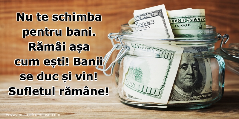 O singură imagine poate să ilustreze complexitatea și frumusețea umanității! Sperăm ca această imagine cu mesajul frumos Nu te schimba pentru bani. Rămâi așa cum ești! Banii se duc și vin! Sufletul rămâne! vă va aduce lumină și inspirație în călătoria dumneavoastră prin lumea umanității.
