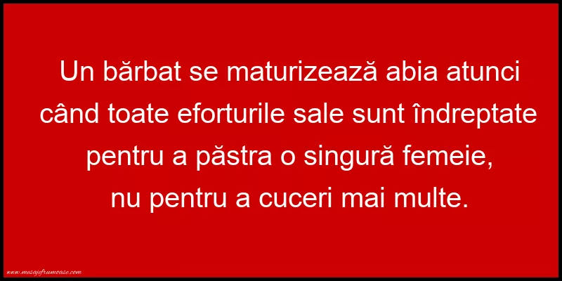 O singură imagine poate să ilustreze complexitatea și frumusețea umanității! Sperăm ca această imagine cu mesajul frumos Un bărbat se maturizează abia atunci când toate eforturile sale sunt îndreptate pentru a păstra o singură femeie, nu pentru a cuceri mai multe. vă va aduce lumină și inspirație în călătoria dumneavoastră prin lumea umanității.