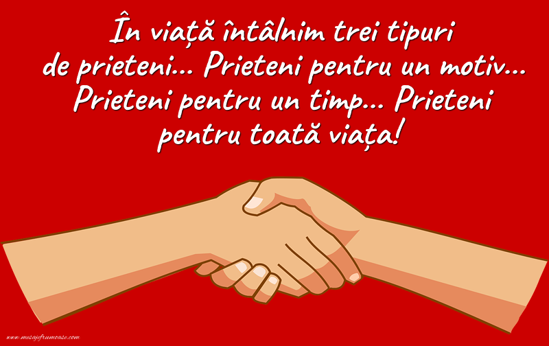 O singură imagine poate să transmită caldura și puterea legăturii dintre prieteni! Sperăm ca această imagine cu mesajul frumos În viață întâlnim trei tipuri de prieteni... Prieteni pentru un motiv... Prieteni pentru un timp... Prieteni pentru toată viața! să vă aducă lumină și inspirație în călătoria dumneavoastră prin lumea prieteniei.