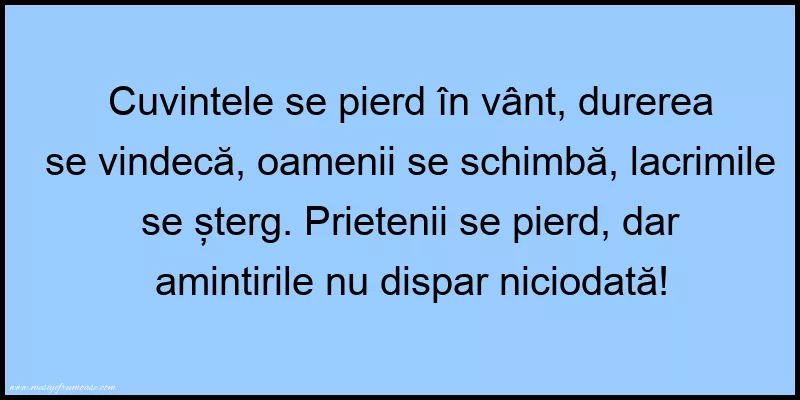Cuvintele se pierd în vânt, durerea se vindecă, oamenii se schimbă, lacrimile se șterg. Prietenii se pierd, dar amintirile nu dispar niciodată!