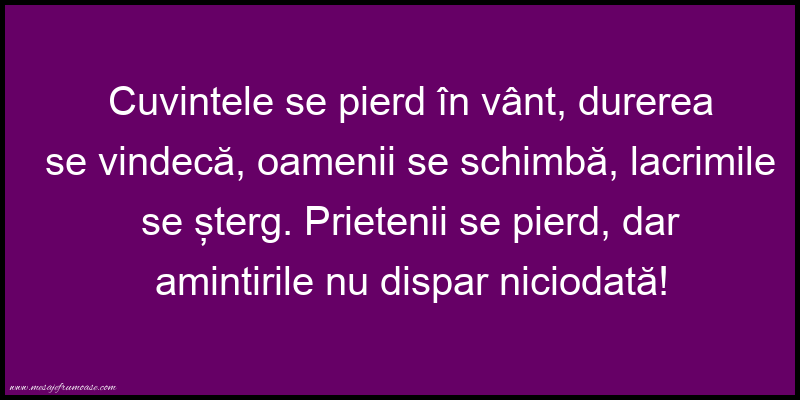 O singură imagine poate să transmită caldura și puterea legăturii dintre prieteni! Sperăm ca această imagine cu mesajul frumos Cuvintele se pierd în vânt, durerea se vindecă, oamenii se schimbă, lacrimile se șterg. Prietenii se pierd, dar amintirile nu dispar niciodată! să vă aducă lumină și inspirație în călătoria dumneavoastră prin lumea prieteniei.