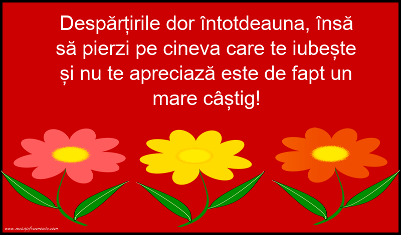 O singură imagine poate să transmită caldura și puterea legăturii dintre prieteni! Sperăm ca această imagine cu mesajul frumos Despărțirile dor întotdeauna, însă să pierzi pe cineva care te iubește și nu te apreciază este de fapt un mare câștig! să vă aducă lumină și inspirație în călătoria dumneavoastră prin lumea prieteniei.