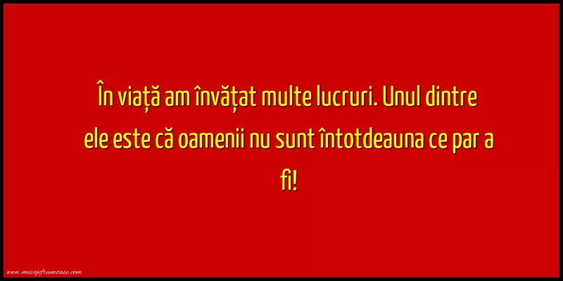 O singură imagine poate spune mai mult decât o mie de cuvinte despre viață! Sperăm ca această imagine cu mesajul frumos În viață am învățat multe lucruri. Unul dintre ele este că oamenii nu sunt întotdeauna ce par a fi! să vă aducă lumină și inspirație în călătoria dumneavoastră prin viață.