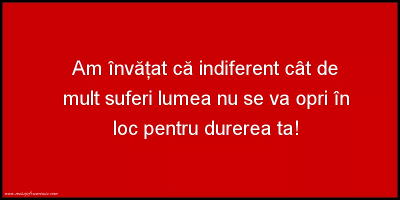 O singură imagine poate spune mai mult decât o mie de cuvinte despre viață! Sperăm ca această imagine cu mesajul frumos Am învățat că indiferent cât de mult suferi lumea nu se va opri în loc pentru durerea ta! să vă aducă lumină și inspirație în călătoria dumneavoastră prin viață.