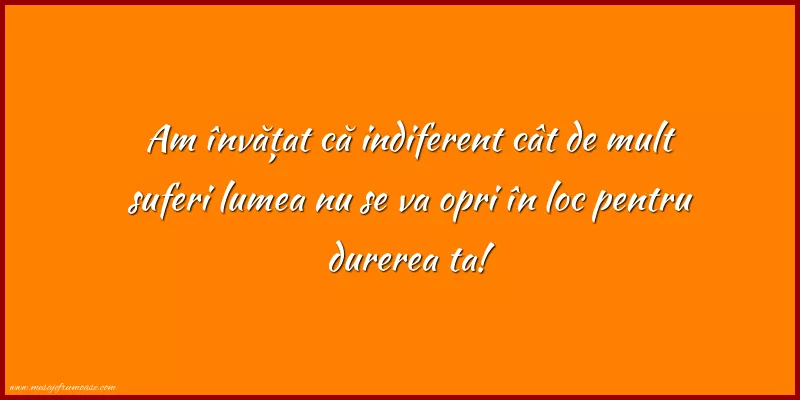 O singură imagine poate spune mai mult decât o mie de cuvinte despre viață! Sperăm ca această imagine cu mesajul frumos Am învățat că indiferent cât de mult suferi lumea nu se va opri în loc pentru durerea ta! să vă aducă lumină și inspirație în călătoria dumneavoastră prin viață.