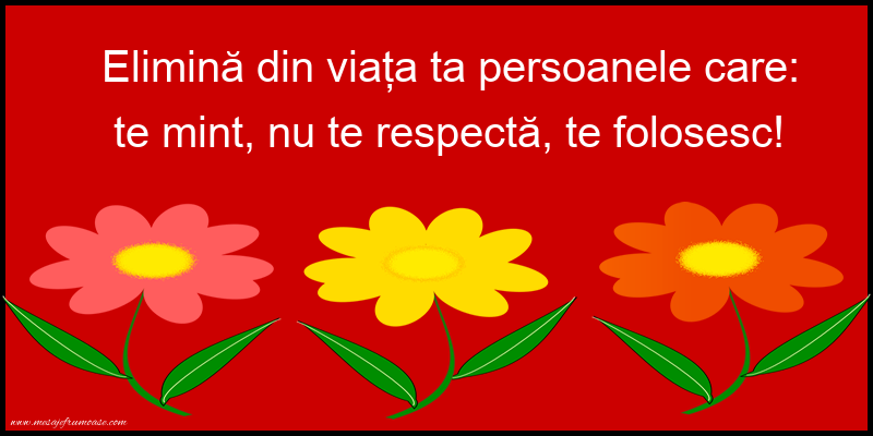 O singură imagine poate spune mai mult decât o mie de cuvinte despre viață! Sperăm ca această imagine cu mesajul frumos Elimină din viața ta persoanele care: te mint, nu te respectă, te folosesc! să vă aducă lumină și inspirație în călătoria dumneavoastră prin viață.