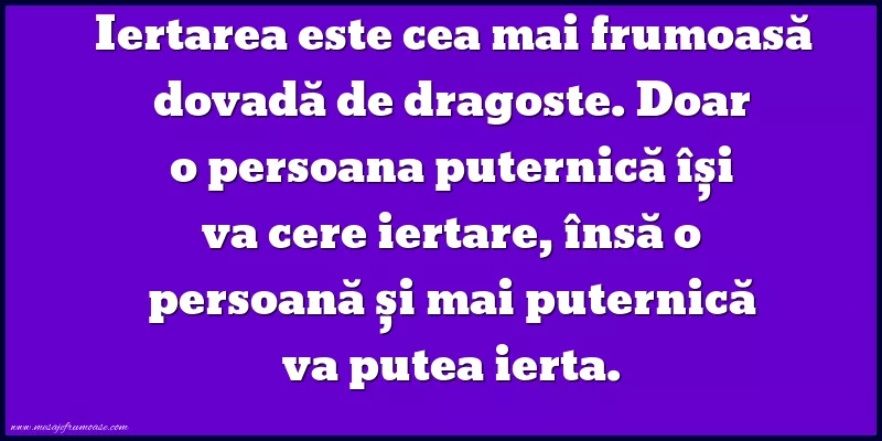 Iertarea este cea mai frumoasă dovadă de dragoste. Doar o persoana puternică își va cere iertare, însă o persoană și mai puternică va putea ierta.