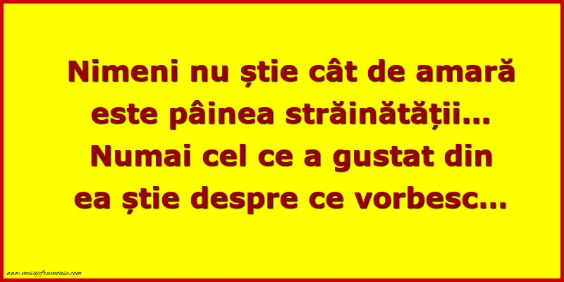 O singură imagine poate spune mai mult decât o mie de cuvinte despre viață! Sperăm ca această imagine cu mesajul frumos Nimeni nu știe cât de amară este pâinea străinătății... Numai cel ce a gustat din ea știe despre ce vorbesc… să vă aducă lumină și inspirație în călătoria dumneavoastră prin viață.