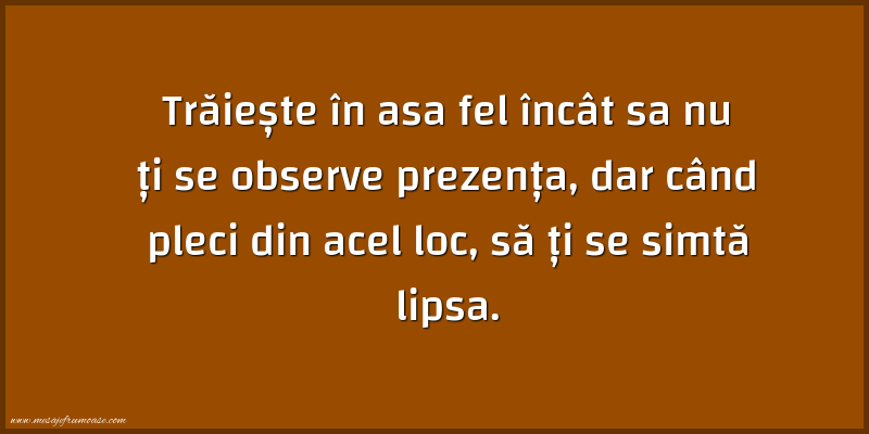 O singură imagine poate spune mai mult decât o mie de cuvinte despre viață! Sperăm ca această imagine cu mesajul frumos Trăiește în asa fel încât sa nu ți se observe prezența, dar când pleci din acel loc, să ți se simtă lipsa. să vă aducă lumină și inspirație în călătoria dumneavoastră prin viață.