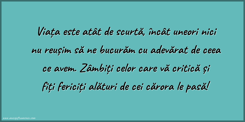 O singură imagine poate spune mai mult decât o mie de cuvinte despre viață! Sperăm ca această imagine cu mesajul frumos Viața este atât de scurtă, încât uneori nici nu reușim să ne bucurăm cu adevărat de ceea ce avem. Zâmbiți celor care vă critică și fiți fericiți alături de cei cărora le pasă! să vă aducă lumină și inspirație în călătoria dumneavoastră prin viață.