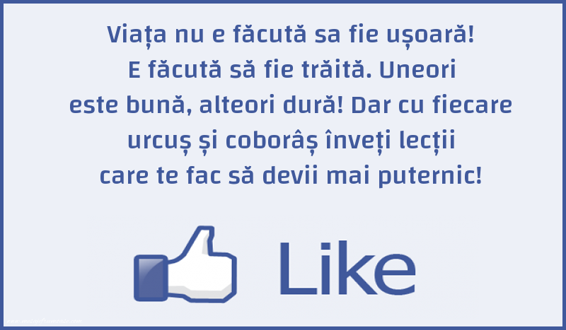O singură imagine poate spune mai mult decât o mie de cuvinte despre viață! Sperăm ca această imagine cu mesajul frumos Viața nu e făcută sa fie ușoară! E făcută să fie trăită. Uneori este bună, alteori dură! Dar cu fiecare urcuș și coborâș înveți lecții care te fac să devii mai puternic! să vă aducă lumină și inspirație în călătoria dumneavoastră prin viață.
