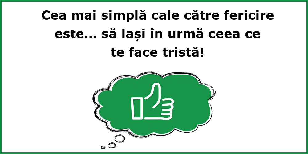 O singură imagine poate să transmită bucuria și lumina fericirii! Sperăm ca această imagine cu mesajul frumos Cea mai simplă cale către fericire este... să lași în urmă ceea ce te face tristă! vă va aduce lumină și inspirație în călătoria dumneavoastră spre o viață plină de fericire și satisfacție.