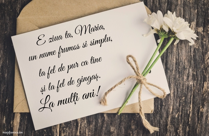 Imaginea cu textul E ziua ta, Maria, un nume frumos si simplu, la fel de pur ca tine și la fel de gingaș. La mulți ani! este ideală pentru a marca această sărbătoare Sfântă și pentru a oferi o bucurie celor ce poartă numele Maria.