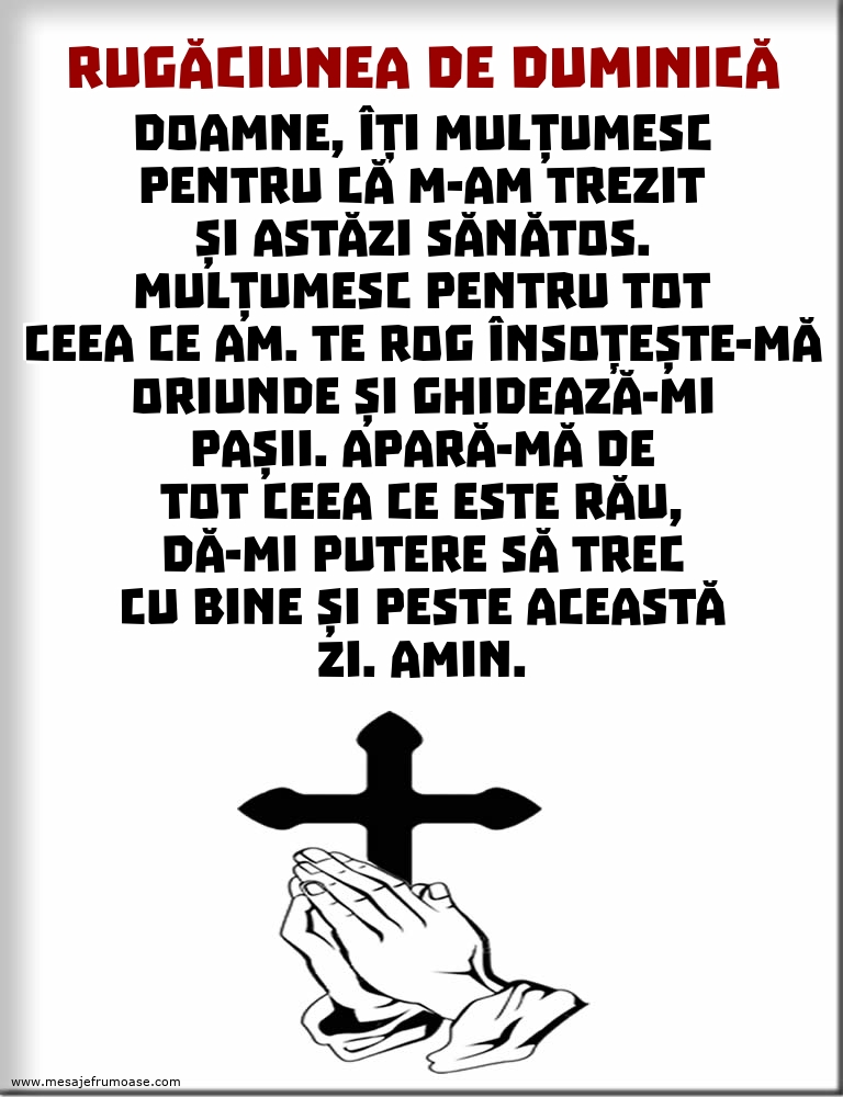 Această rugăciune de duminică cu textul frumos Doamne, îți mulțumesc pentru că m-am trezit și astăzi sănătos. Mulțumesc pentru tot ceea ce am. Te rog însoțește-mă oriunde și ghidează-mi pașii. Apară-mă de tot ceea ce este rău, dă-mi putere să trec cu bine și peste această zi. Amin. ne îndeamnă să ne amintim de importanța recunoștinței și mulțumirii pentru darurile vieții, să căutăm iertare și vindecare pentru greșelile noastre și să ne încurajăm unii pe alții în credință și speranță.