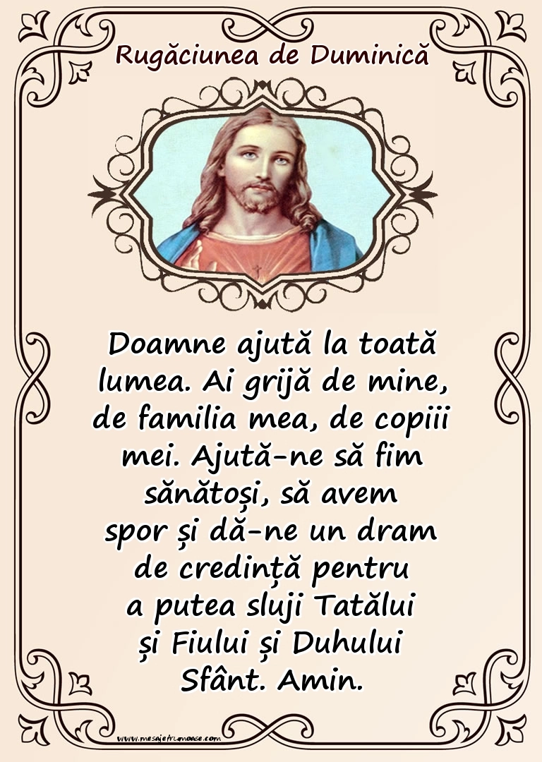 Această rugăciune de duminică cu textul frumos Doamne ajută la toată lumea. Ai grijă de mine, de familia mea, de copiii mei. Ajută-ne să fim sănătoși, să avem spor și dă-ne un dram de credință pentru a putea sluji Tatălui și Fiului și Duhului Sfânt. Amin. ne îndeamnă să ne amintim de importanța recunoștinței și mulțumirii pentru darurile vieții, să căutăm iertare și vindecare pentru greșelile noastre și să ne încurajăm unii pe alții în credință și speranță.