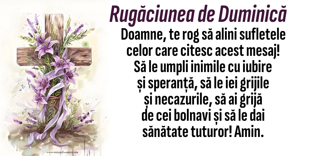 Această rugăciune de duminică cu textul frumos Doamne, te rog să alini sufletele celor care citesc acest mesaj! Să le umpli inimile cu iubire și speranță, să le iei grijile și necazurile, să ai grijă de cei bolnavi și să le dai sănătate tuturor! Amin. ne îndeamnă să ne amintim de importanța recunoștinței și mulțumirii pentru darurile vieții, să căutăm iertare și vindecare pentru greșelile noastre și să ne încurajăm unii pe alții în credință și speranță.