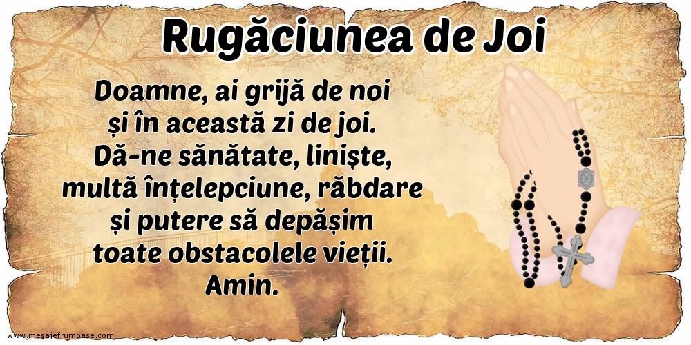 Această rugăciune de joi cu textul frumos Doamne, ai grijă de noi și în această zi de joi. Dă-ne sănătate, liniște, multă înțelepciune, răbdare și putere să depășim toate obstacolele vieții. Amin. ne îndeamnă să ne aplecăm inimile și să ne exprimăm recunoștința pentru tot ceea ce ne înconjoară, să ne rugăm pentru ghidare și înțelepciune în fața provocărilor și să ne susținem reciproc în călătoria noastră spirituală.