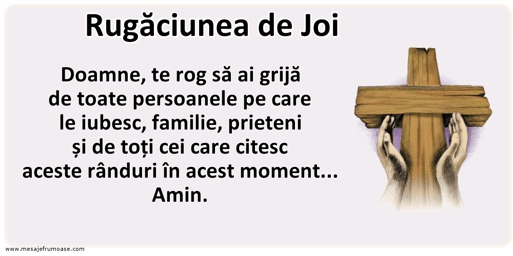 Această rugăciune de joi cu textul frumos Doamne, te rog să ai grijă de toate persoanele pe care le iubesc, familie, prieteni și de toți cei care citesc aceste rânduri în acest moment... Amin. ne îndeamnă să ne aplecăm inimile și să ne exprimăm recunoștința pentru tot ceea ce ne înconjoară, să ne rugăm pentru ghidare și înțelepciune în fața provocărilor și să ne susținem reciproc în călătoria noastră spirituală.
