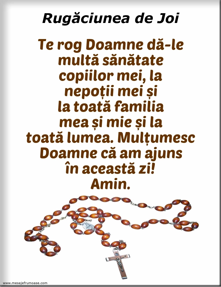 Te rog Doamne dă-le multă sănătate copiilor mei, la nepoții mei și la toată familia mea și mie și la toată lumea. Mulțumesc Doamne că am ajuns în această zi! Amin.